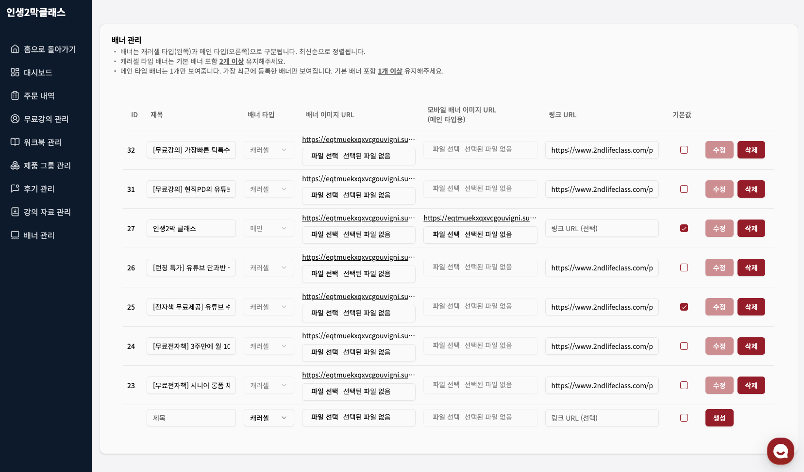 메인/슬라이드 배너를 URL 링크와 함께 즉시 등록·수정하며, 기간별 캠페인을 유연하게 운영합니다.