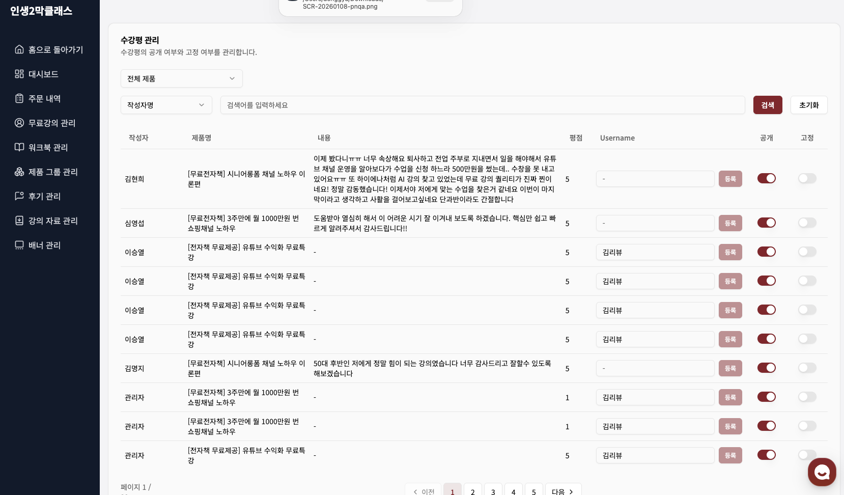 베스트 후기를 상단에 고정(Pin)하거나, 악성 리뷰를 비공개 처리하여 구매 전환율을 적극적으로 관리합니다.
